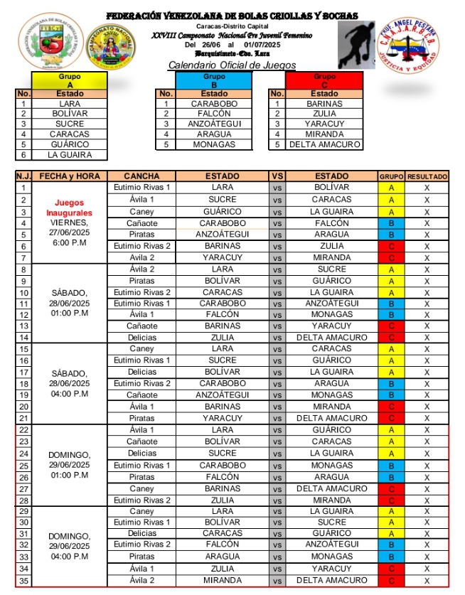 Con gran entusiasmo y espíritu competitivo, se celebró la primera fecha del XXVIII Campeonato Nacional Juvenil Femenino de Bolas Criollas, organizado por la Federación Venezolana de Bolas Criollas y Bochas, y la Asociación de este deporte en esta entidad. El evento, que se desarrolla en la ciudad de Barquisimeto, estado Lara, reúne a jóvenes atletas de todo el país en una fiesta deportiva que honra nuestras tradiciones.