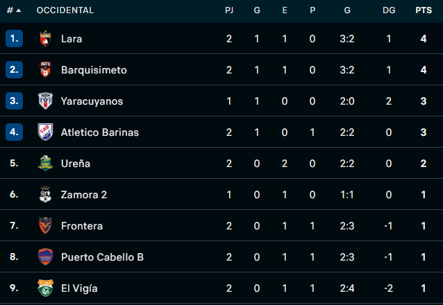 La segunda división del fútbol venezolano ha definido sus primeras jerarquías tras completarse una fecha de alta intensidad en el grupo occidental y el estreno oficial de la zona centro oriental. El Barquisimeto SC y el Deportivo Lara se han posicionado en lo más alto de la clasificación con 4 unidades, producto de una victoria y un empate en sus dos primeras presentaciones. Ambos equipos comparten la punta presentando registros idénticos de tres goles a favor, dos en contra y una diferencia positiva de un tanto.