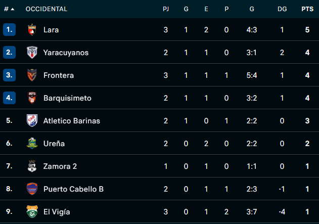 En otros resultados del Grupo Occidental, el Real Frontera venció 3-1 a El Vigía, mientras Barquisimeto SC cumplió con su jornada de descanso establecida en el calendario. La tabla de posiciones mantiene una disputa cerrada, con Lara sumando cinco unidades de los nueve posibles, tras completar sus tres compromisos iniciales del torneo.