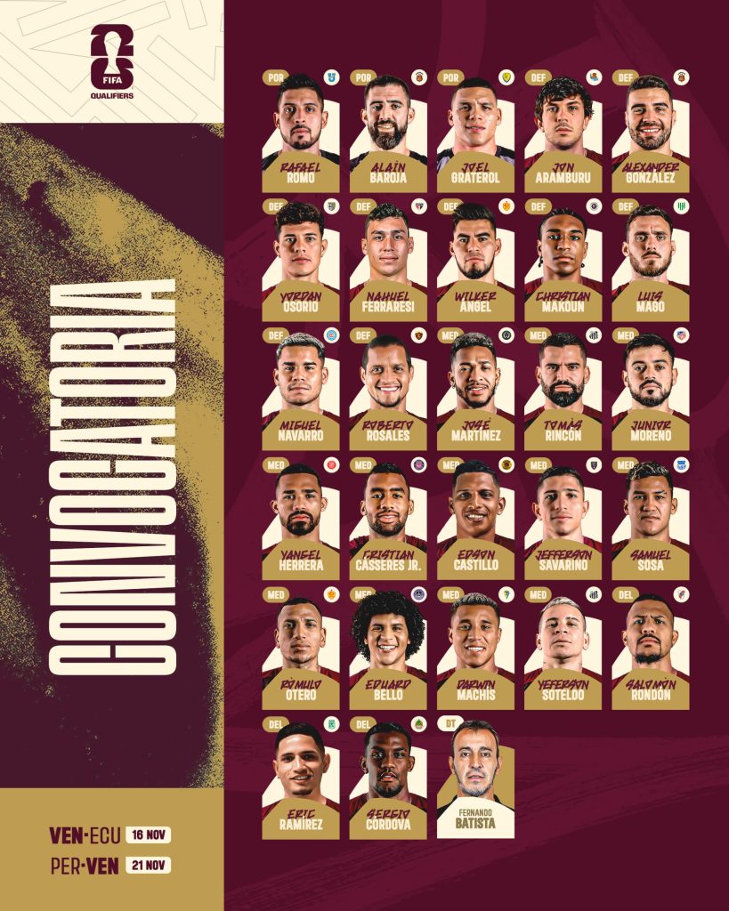 Este lunes 06 de noviembre la Federación Venezolana de Fútbol a través de su departamento de comunicaciones, envió el listado de los jugadores convocados por Fernando Batista, para enfrentar al seleccionado ecuatoriano el próximo 16 de noviembre en Maturín, y al combinado peruano el 21 de noviembre en Lima.