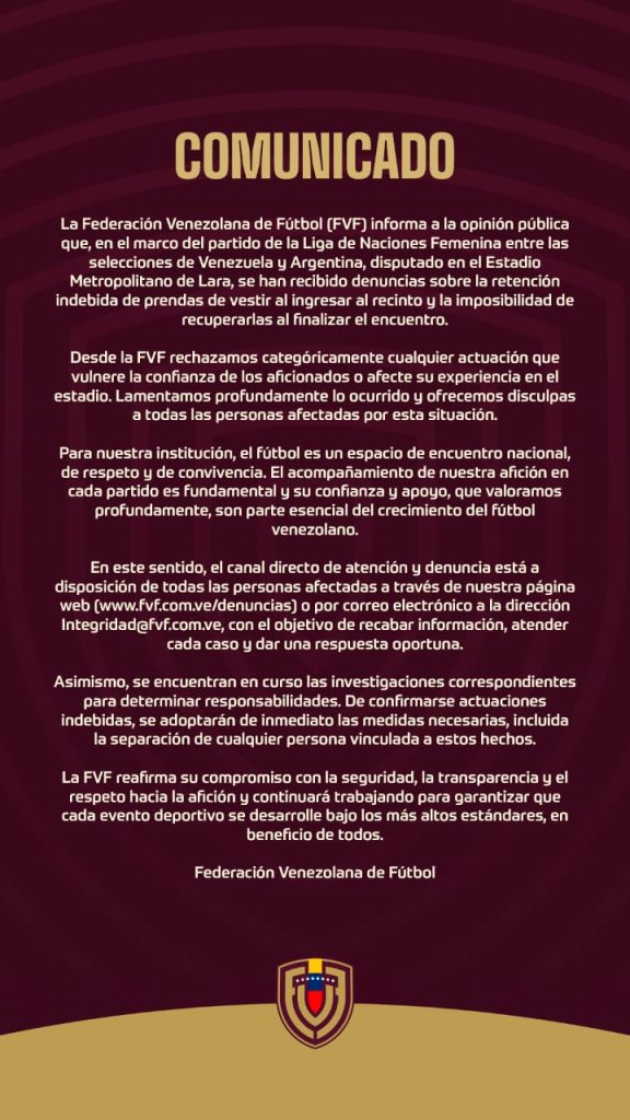 Al día siguiente de la viralización de las protestas por obligar a la gente a quitarse una prenda de vestir, la FVF publicó un comunicado. Un texto que intenta calmar, pero no explica. Que condena la “retención indebida”, pero reconoce entre líneas que la medida fue errada. Que lamenta lo ocurrido, pero asume una responsabilidad tibia. Que menciona la bolsa negra donde estaba la ropa, pero no menciona que la decisión nunca debió existir.