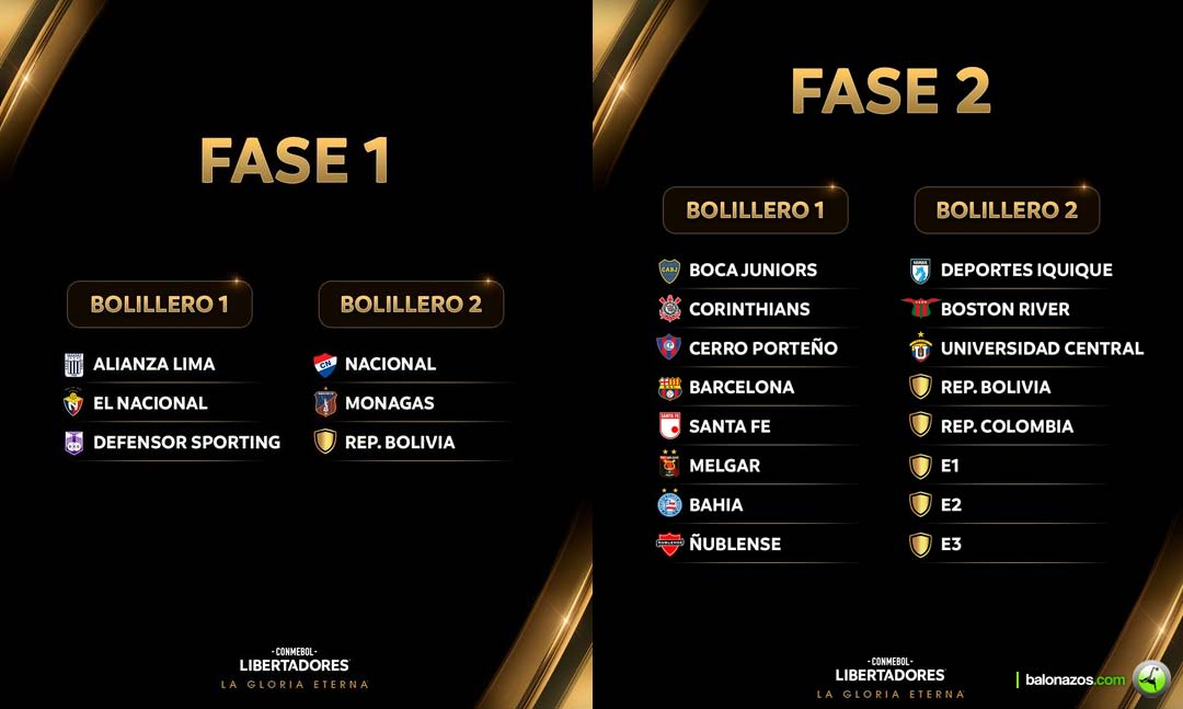 Los equipos de Fase 1 ya están determinados y fueron distribuidos en dos bolilleros para el sorteo. En el Bolillero 1 están Alianza Lima (Perú). El Nacional (Ecuador) y Defensor Sporting (Uruguay. En el Bolillero 2 figuran Nacional (Paraguay), Monagas SC (Venezuela) y un equipo de Ecuador por definir.