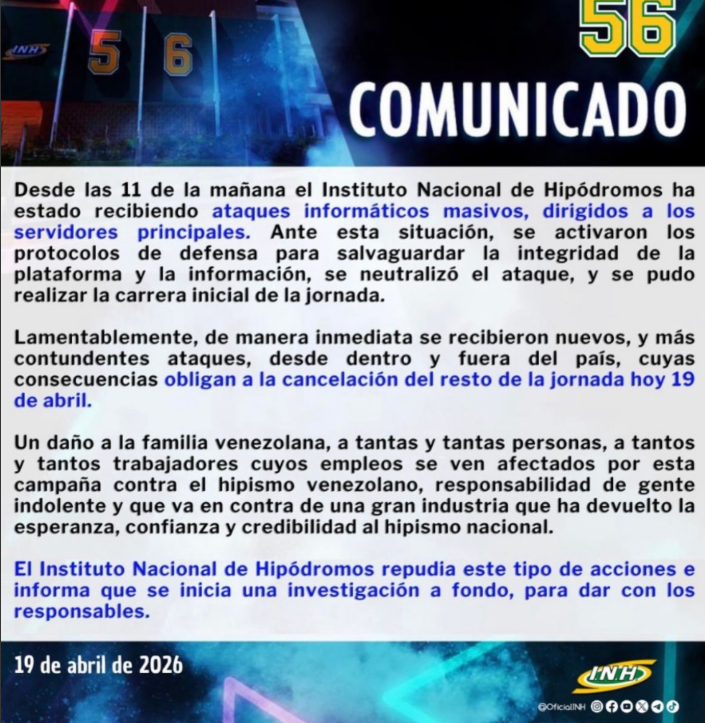 En el hipismo, el Instituto Nacional de Hipódromos habló de “ataques cibernéticos” para justificar la suspensión de una jornada, no se dijo, cómo, cuándo o dónde, solo habló de la situación. Días después, la presidencia del INH cambió. El comunicado, que sonaba a excusa técnica, terminó siendo la antesala de un remezón interno que el texto nunca se atrevió a mencionar.