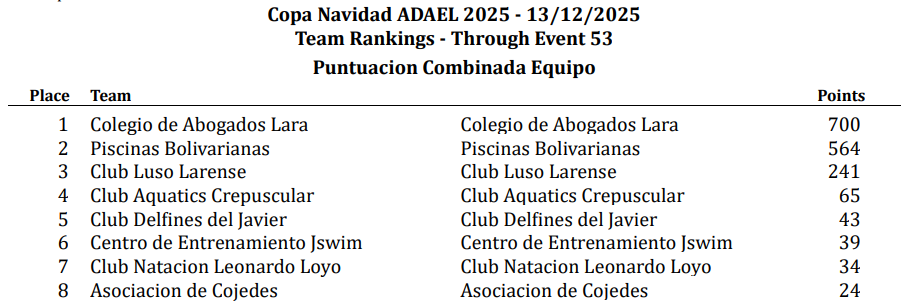 En la disciplina de natación, el Colegio de Abogados Lara se consagró campeón de la puntuación combinada por equipos con 700 puntos, seguido por Piscinas Bolivarianas (564) y el Club Luso Larense (241). La jornada reafirmó el nivel competitivo de los clubes locales y regionales, que se dieron cita en el evento para cerrar el año deportivo.