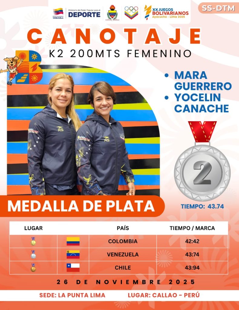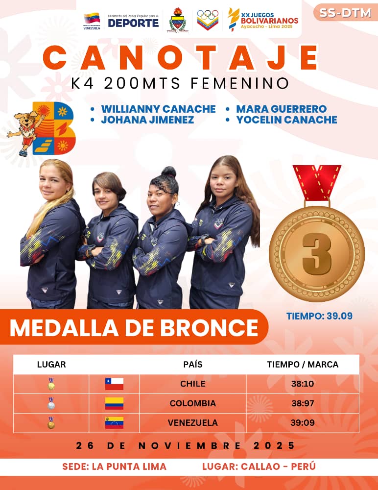 Además, en el canotaje femenino K2 200 metros, Mara Guerrero y Yocelin Canache lograron la medalla de plata con un tiempo de 43.74 segundos, mientras que en el K4 200 metros femenino, el equipo conformado por Willianny Canache, Johana Jiménez, Mara Guerrero y Yocelin Canache se quedó con la medalla de bronce, cerrando una mañana productiva para el deporte acuático venezolano.