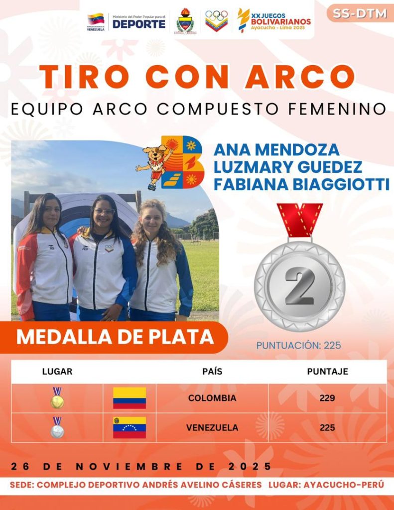 En el tiro con arco compuesto femenino por equipos, Venezuela alcanzó la medalla de plata gracias a la actuación de Ana Mendoza, Luzmary Guédez y la larense Fabiana Biagiotti, quienes sumaron 225 puntos, quedando a tan solo cuatro unidades del oro, que fue obtenido por Colombia con 229. Por su parte Eduardo Gonzáles, Diego Camacho y el lerense lograron la medalla de bronce en equipo arco compuesto masculino. Estos resultados no solo representan medallas para el país, sino también un reconocimiento al talento larense que sigue dejando huella en el deporte internacional.