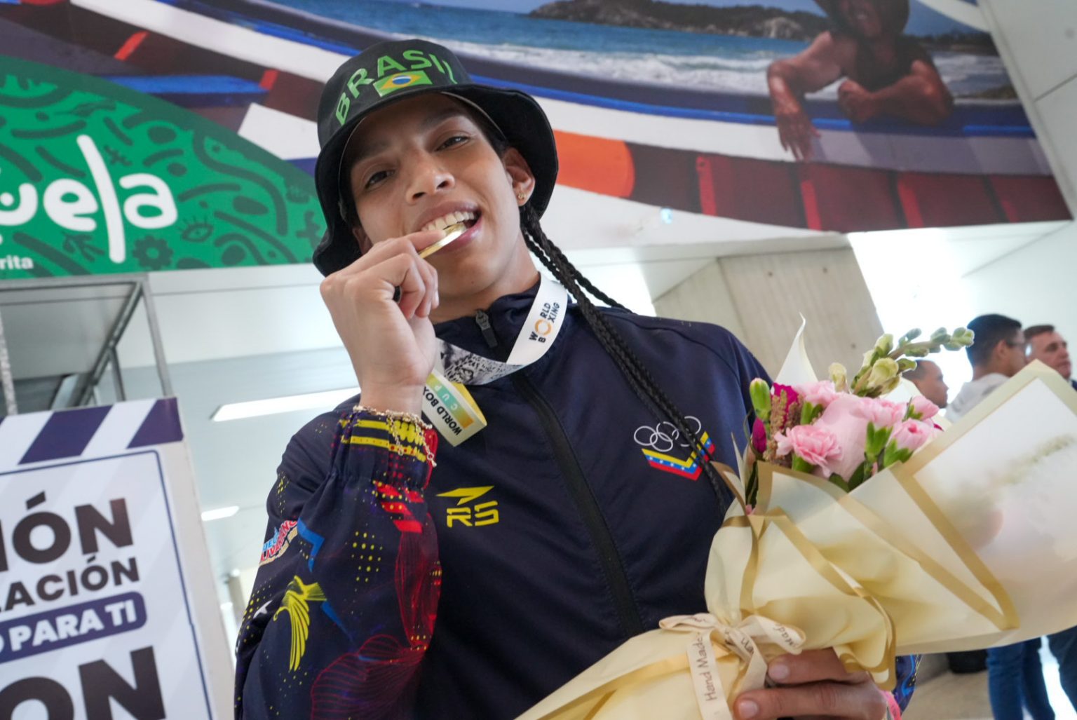 Con la histórica medalla de oro de los 57 kilogramos colgada en el cuello, la campeona mundial fue sorprendida al descenso del avión por las máximas autoridades deportivas, Franklin Cardillo, Ministro del Poder Popular para el Deporte, y viceministro de Alto Rendimiento, Henyelberrh Herrera, quienes la agasajaron con obsequios a su llegada.