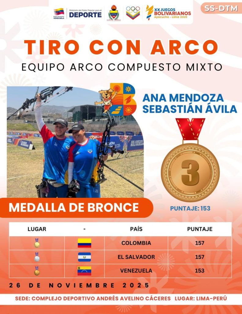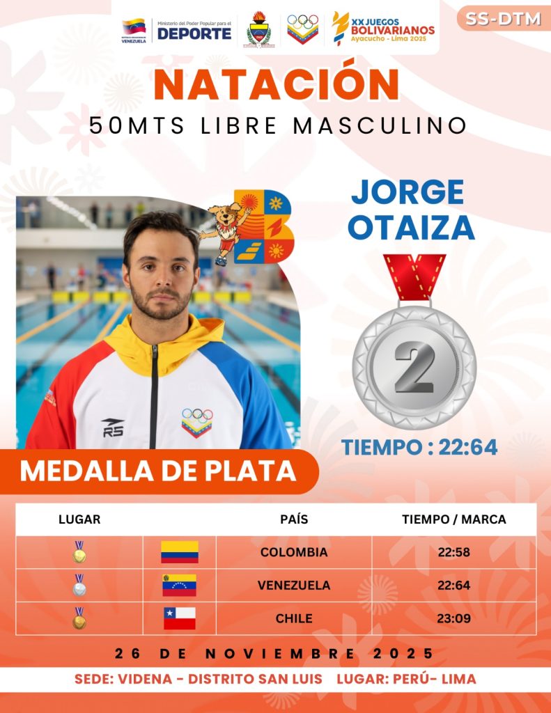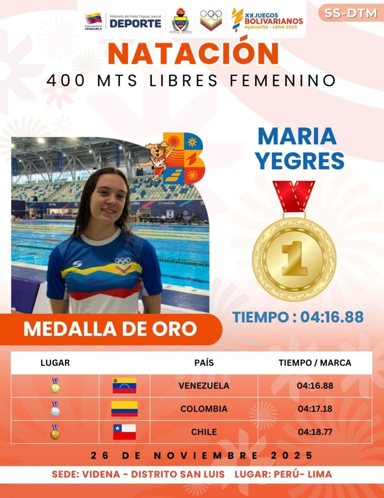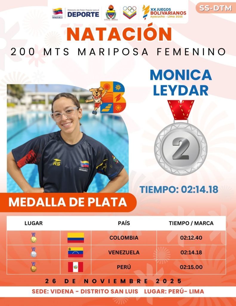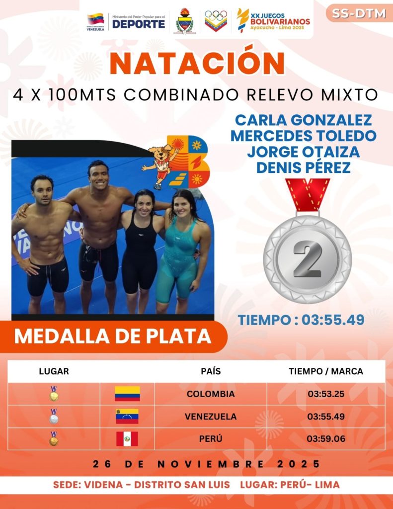 La delegación venezolana vivió una jornada de alto rendimiento este miércoles 26 de noviembre en los Juegos Bolivarianos Ayacucho–Lima 2025, con la natación como disciplina protagonista al conquistar dos medallas de oro y dos de plata en pruebas de velocidad, resistencia y estilo.