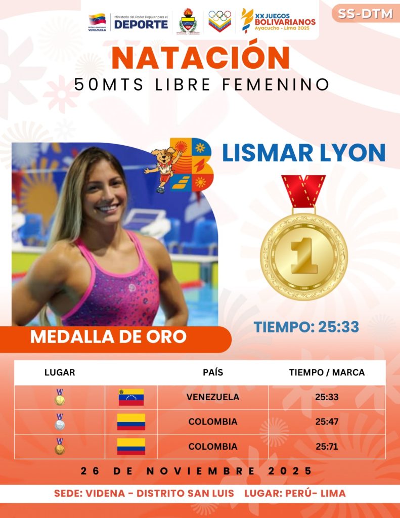 La primera medalla dorada llegó gracias a Lismar Lyon, quien se impuso en los 50 metros libre femenino con un tiempo de 25.33 segundos, superando por estrecho margen a sus rivales colombianas. Posteriormente, María Yegres reafirmó su dominio en los 400 metros libre femenino, logrando el oro con una marca de 4:16.88 en una carrera de gran exigencia técnica.